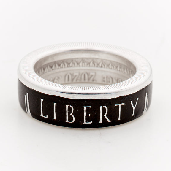 These Liberty or Death coin rings are expertly handcrafted from a one ounce solid silver coin. Featuring the famous motto, “Liberty or Death”, a quotation from the speech Patrick Henry made to the Second Virginia Convention in Richmond, Virginia in 1775, this ring is a piece of Americana and should be worn with pride.