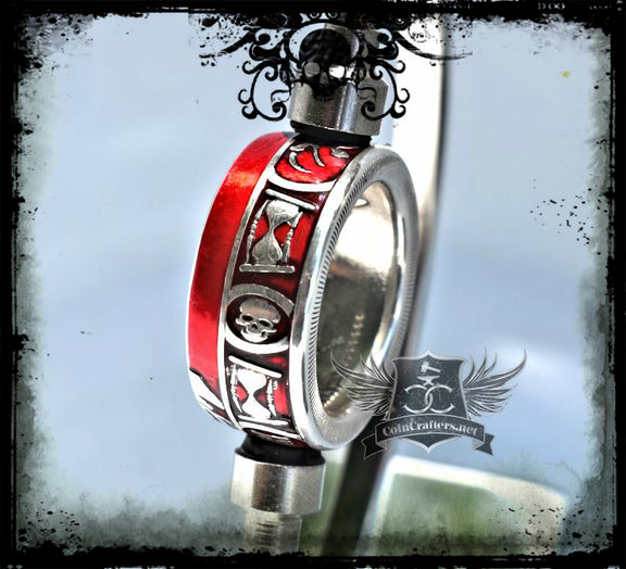 A new offering to our premium coin rings section! The copper version of our Memento Mori coin rings were such a hit we have decided to step it up a notch and offer them in solid .999 silver in your choice of red or black powder coat to make them really stand out. The ring in the pics above is the red with silver highlights version but if preferred, it can also be made in solid black with silver highlights.