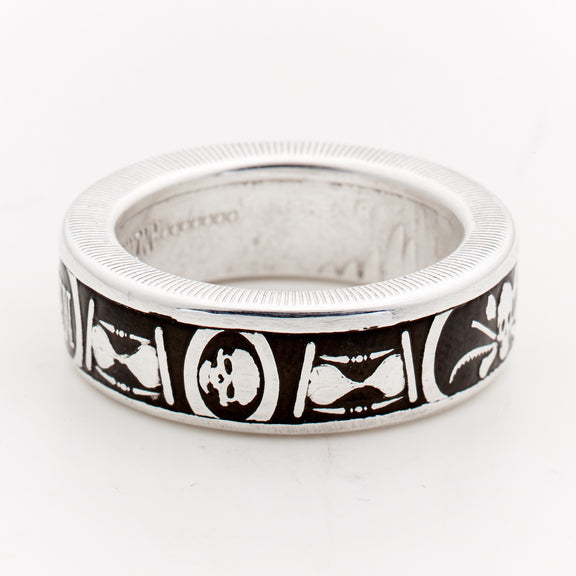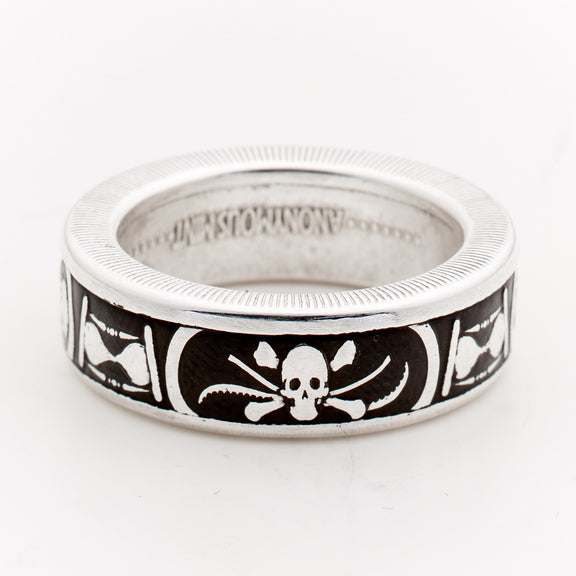 These rings are expertly handcrafted from a one ounce solid .999 fine silver round. Featuring the Latin phrase, “Memento Mori,” which means, Remember Death, the coin aptly entitled, “The Last Laugh” is reminiscent of funeral art popular in the eighteenth century. The warning reminds us that death can come at any time and will always have the last laugh. A dark and foreboding piece, these rings are sure to make a statement in any crowd.